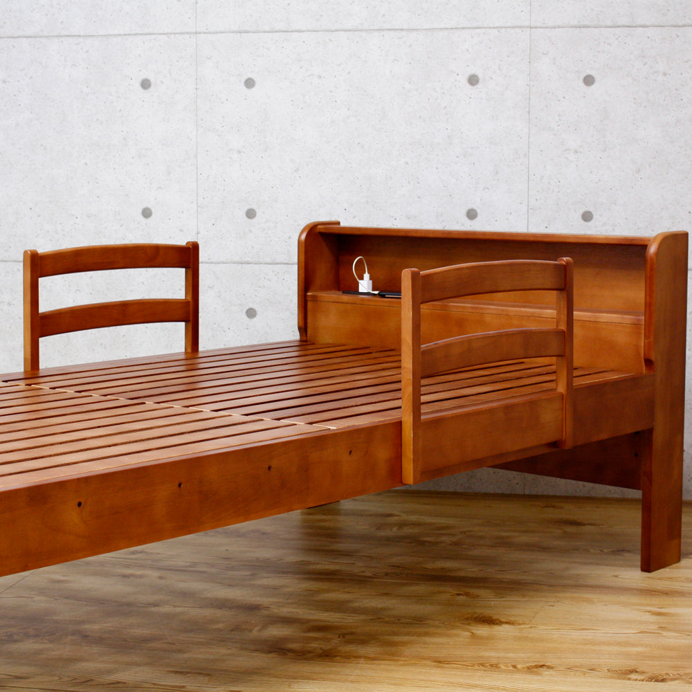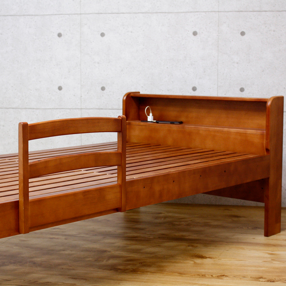 高さ調整可能なサイドフレームと手すり付きで、お子様からご年配の方まで安心してご利用いただける木製ベッドです。ラバーウッド材を使用し、自然な風合いと丈夫さを両立。床板にはパイン材を使用し、通気性にも優れています。